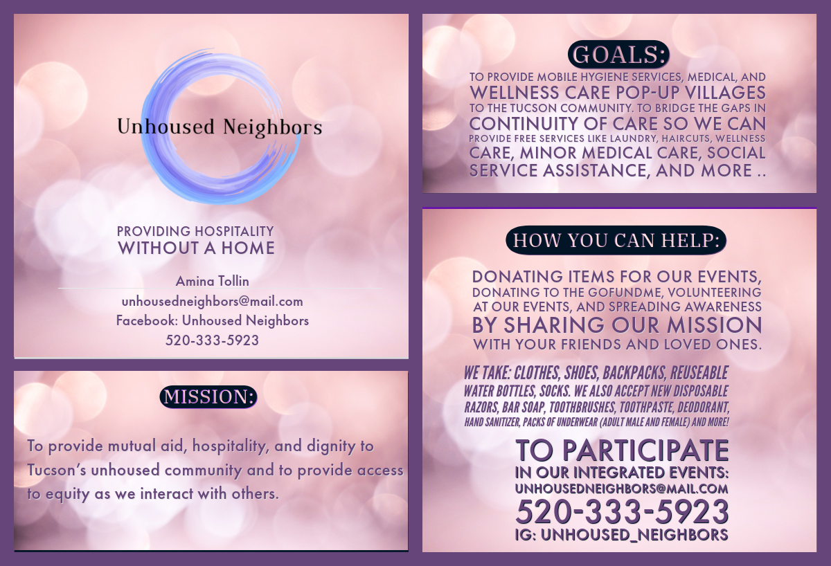 We are a non-profit, mutual aid organization that works to support and elevate awareness for our local houseless communities.